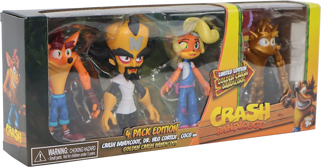 CRASH BANDICOOT GAMING ACTION FIGURES | Jump into the world of Crash Bandicoot with these 11cm Crash Bandicoot figures with accessory Aku Aku mask and stand. In this pack is one classic Crash Bandicoot toy, as well as Coco, Dr. Cortex, and a special edition Golden Crash Bandicoot.