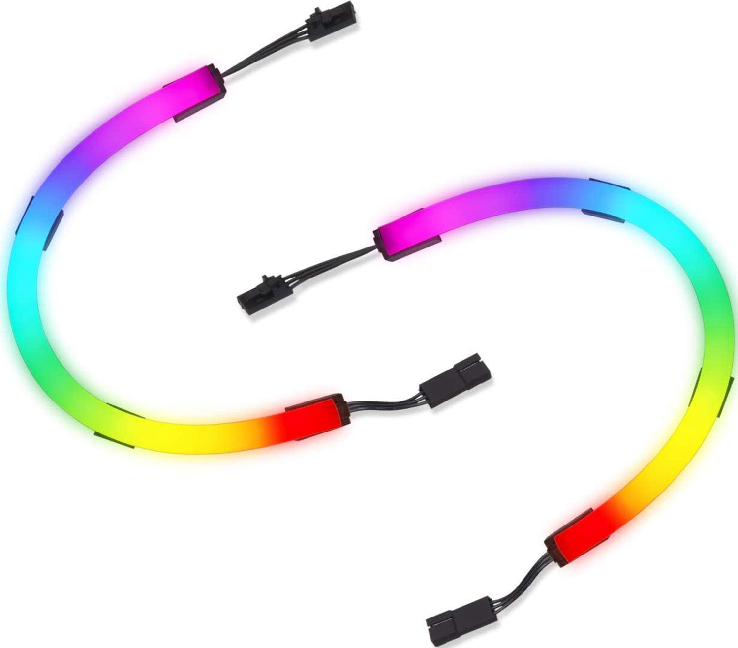 Includes 2x long strips (450mm) with 27 individually addressable LEDs each, 2x short strips (250mm) with 15 individually addressable LEDs each, an external lighting controller, USB cable, and external power cable.