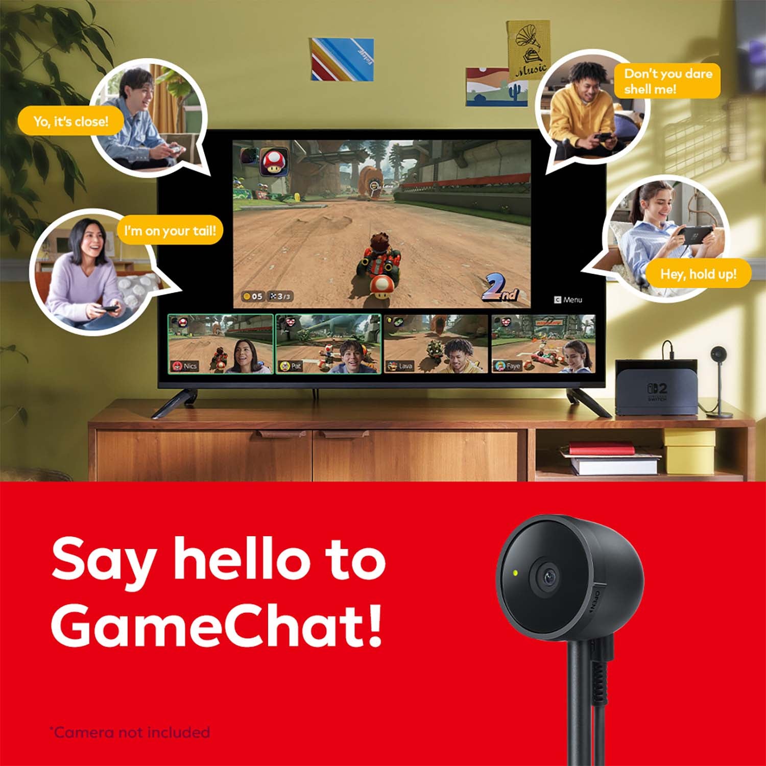 Say "hello" to GameChat*** - Start a chat with friends at any time using the C Button! Share your game screen while chatting to show what you're up to. And for a more personal touch, connect face-to-face with the Nintendo Switch 2 camera or other compatible USB-C® camera (each sold separately).