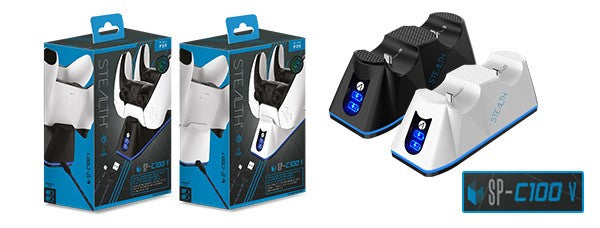 The STEALTH C100V Twin Charging Dock is designed to enhance your PlayStation 5 Gaming experience. Compatible with PlayStation 5. The C100V Twin Charging Dock features USB C to USB C charging connection for faster charging and 2 in 1 functionality for play and charge and when not in use. The design compliments the the PlayStation 5 with abstract features and LED lighting.