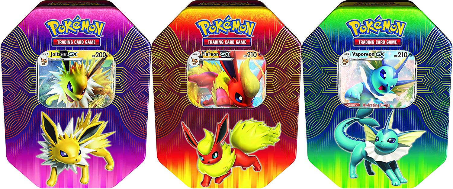 Choose the hydro-powered Vaporeon-GX, the crackling Jolteon-GX, or the fiery marvel of Flareon-GX in the Pokémon Trading Card Game: Elemental Power Tin.