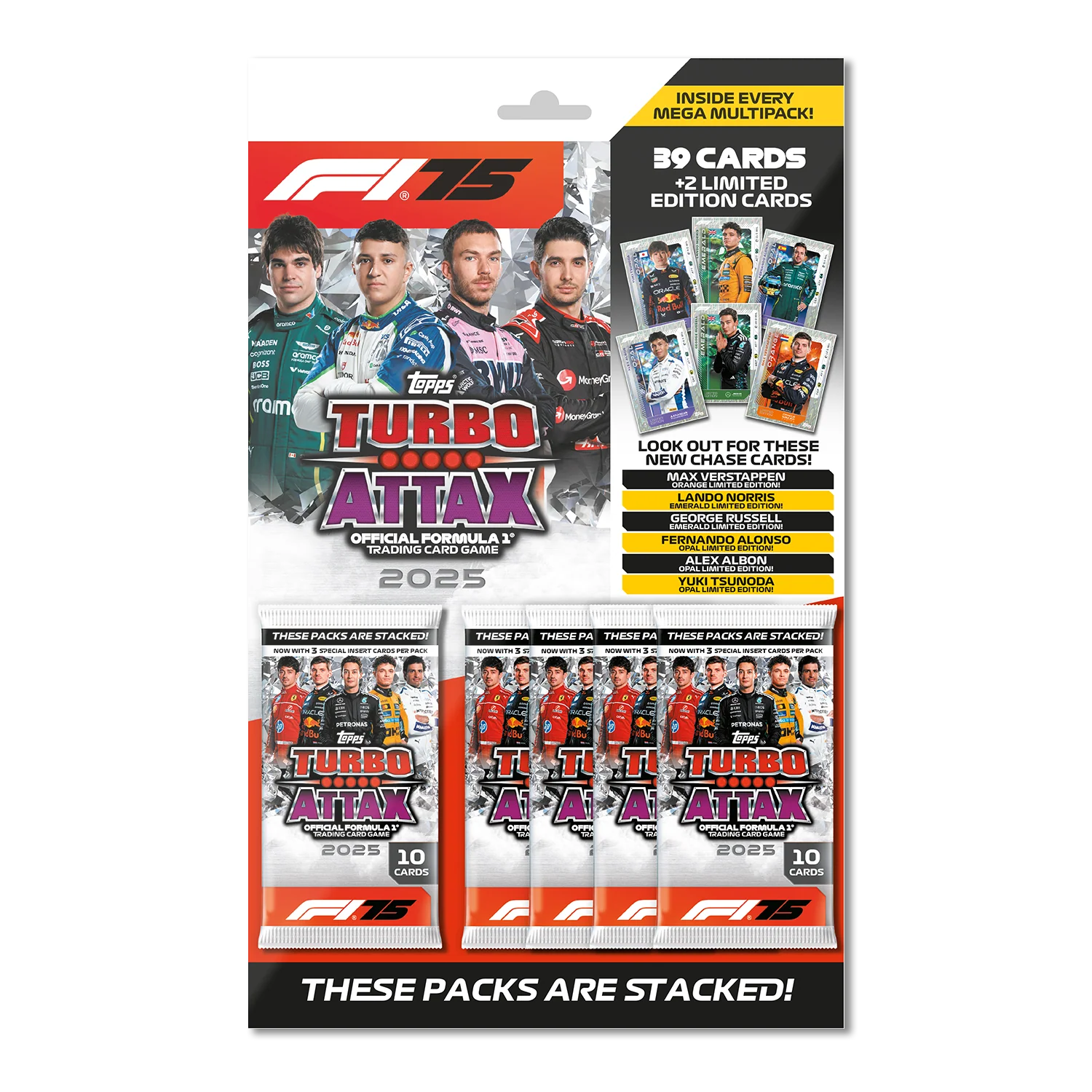 Topps Turbo Attax 2025 races back for another jam-packed season of collecting with over 400 outstanding new cards to collect. New card categories such as Rainmaster, Team Dynasty, Pole Position, Track Profiles, National Pride, Rookie Rising, F2 Team cards, F3 Team cards, Pit Stop Pros and Constructor Kings will inspire every collector. There are returning favourites such as Podium Power, 100 Club, F1 Super Novas, Stars of Tomorrow, Epic Moments plus the biggest ever collection of Legends, with 18 Icons of the Grid cards to collect. Helping to celebrate F1's 75th Anniversary are the rare 'Diamond Pull' chase cards and the Diamond Edition Mega Tin where lucky collectors have a chance to find a Legend Relic card! Look out for fan favourite Limited Editions such as McLaren Papaya, Brazilian Yellow and Red Hot Chilli plus Diamond parallels are available throughout the collection. #thesepacksarestacked